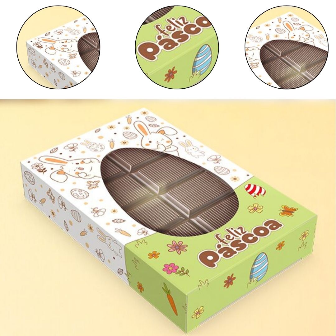 A CAIXA TABLETE P DA LINHA PÁSCOA COLORIR É INTERATIVA E ENCANTADORA. COM VISOR TRANSPARENTE, OFERECE UMA EXPERIÊNCIA DIVERTIDA E VALORIZA TABLETES DE ATÉ 150G E CHOCOLATES ARTESANAIS.