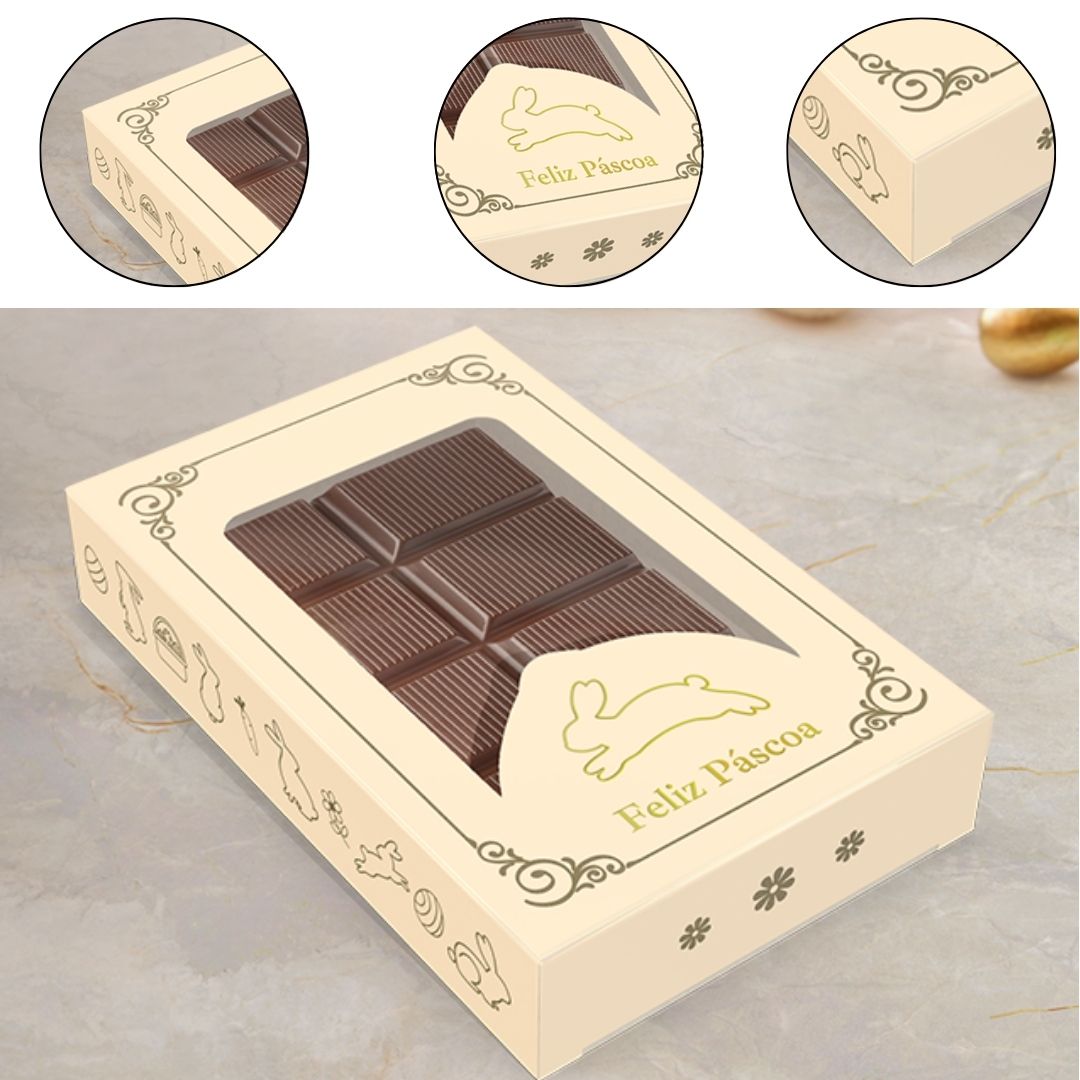 Com acabamento em hot stamping ouro e visor transparente, valoriza tabletes de até 150g e chocolates artesanais.