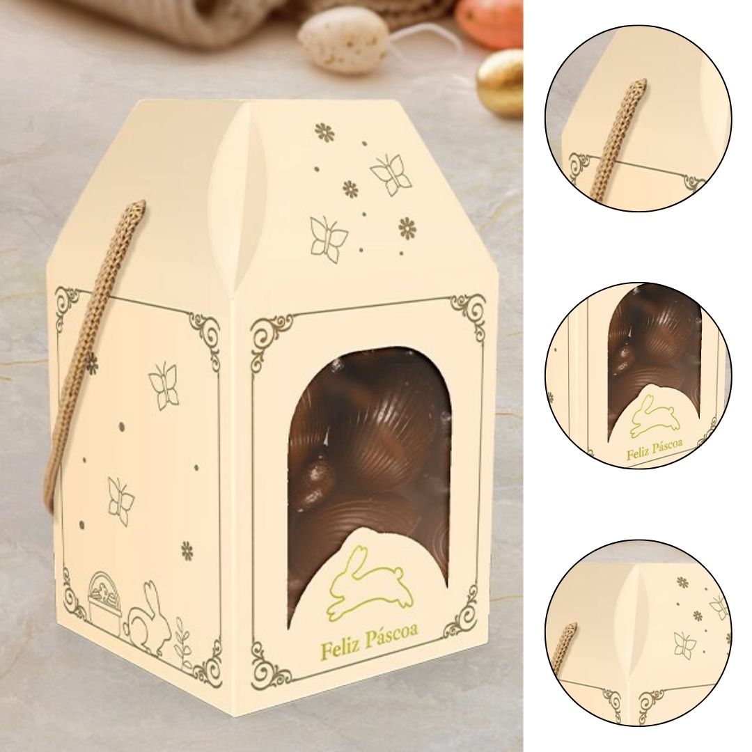 A Caixa com Alça da linha Páscoa Luz une praticidade e elegância em uma única embalagem.