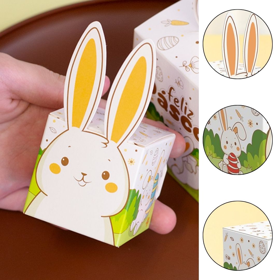 A CAIXA ORELHA PARA 1 DOCE DA LINHA PÁSCOA ENCANTOS É DELICADA E ENCANTADORA, PERFEITA PARA PEQUENOS MIMOS. COM DESIGN TEMÁTICO DE COELHINHO E ACABAMENTO DE QUALIDADE, TRANSFORMA SIMPLES DOCES EM MIMOS CHEIOS DE CHARME.