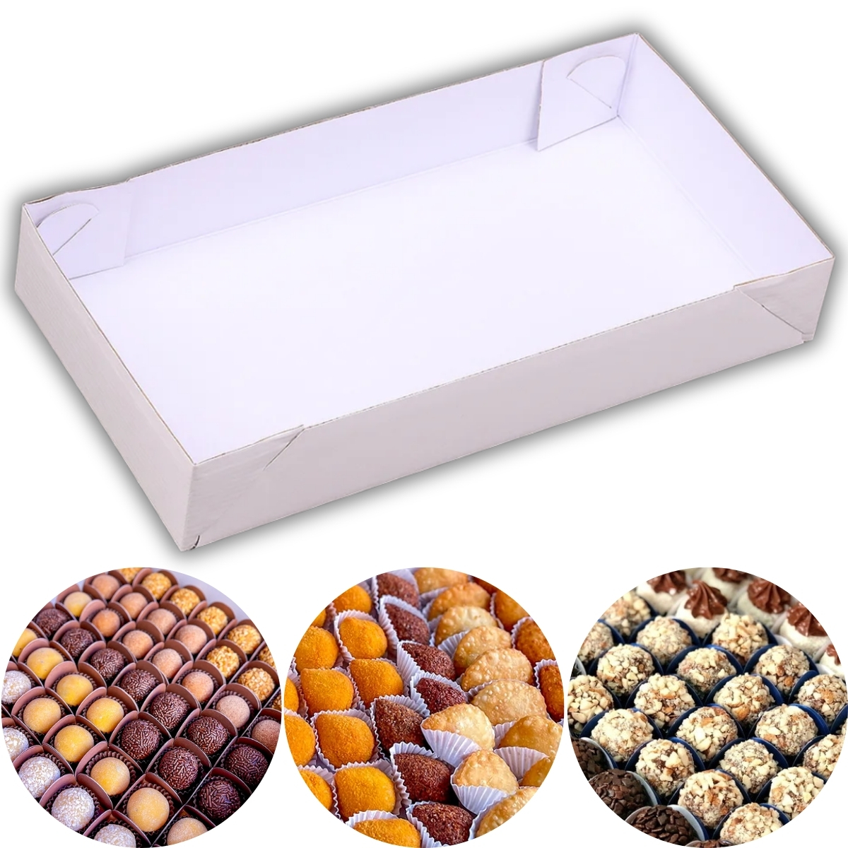 A embalagem contém bases desmontadas com tampas de acetato inclusas, prontas para montagem prática e rápida. Ideal para quem busca agilidade na produção com alto padrão de entrega e um excelente custo-benefício para vendas em volume. Pode ser usada para 50 salgados, indicamos colocar papel antigordura.