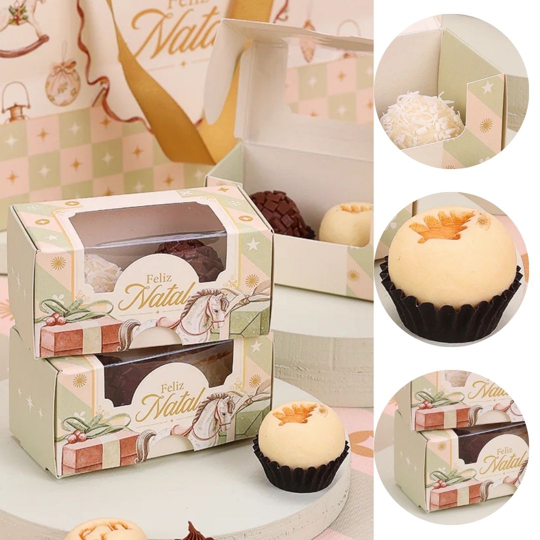 Frente: Apresenta um visor transparente que valoriza os doces no interior, acompanhado da mensagem “Feliz Natal” em tipografia dourada. A ilustração traz um presente decorado com laço verde e o cavalinho de balanço delicadamente desenhado.