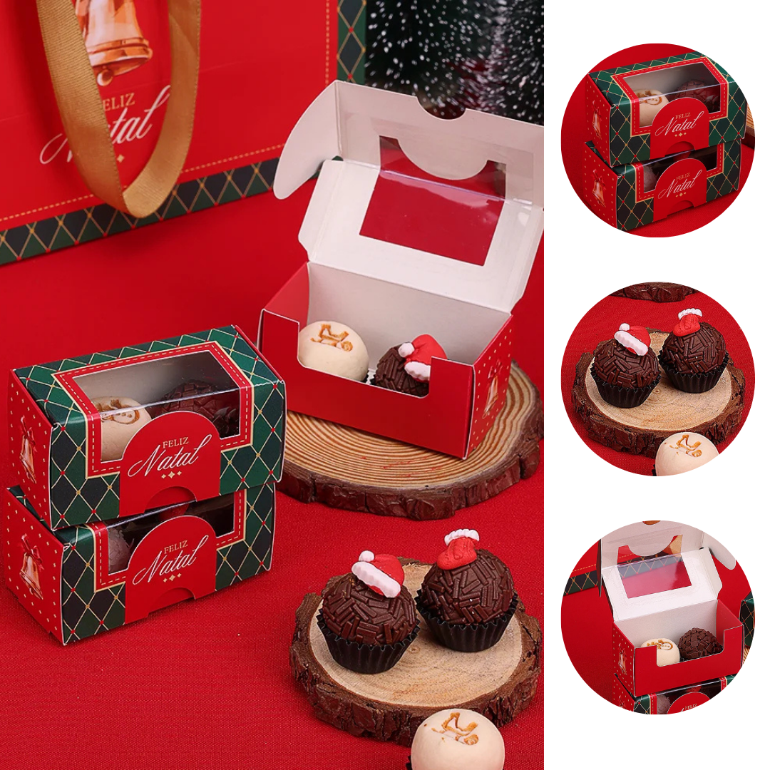 FRENTE: A PARTE DA FRENTE É UMA MOLDURA RETANGULAR VERMELHA COM A FRASE "FELIZ NATAL" EM CALIGRAFIA DOURADA. NO CENTRO, HÁ UMA JANELA TRANSPARENTE QUE PERMITE VER O CONTEÚDO DA CAIXA.