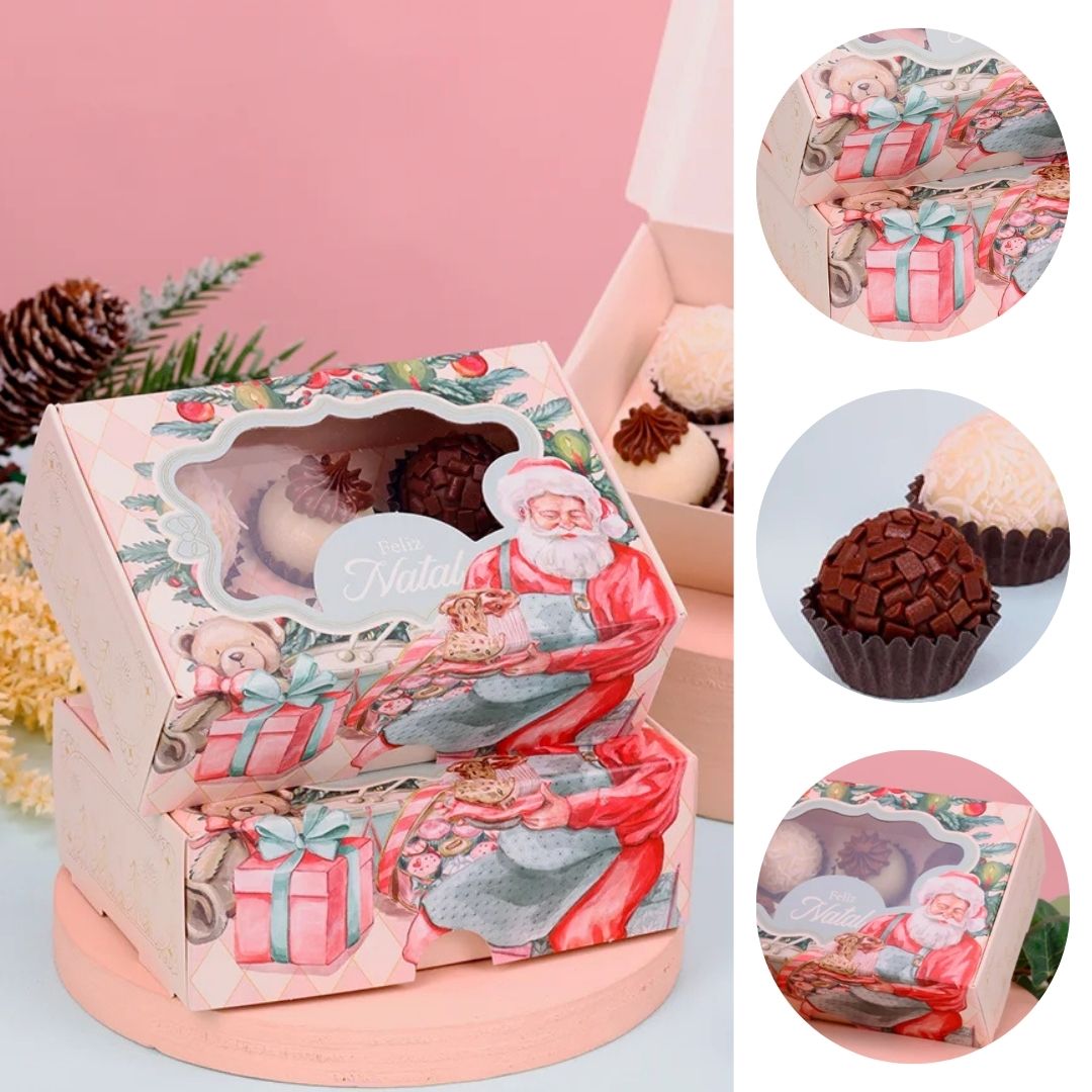 Caixa: A base da caixa segue o mesmo padrão de losangos e cores, com a continuação da ilustração do Papai Noel.