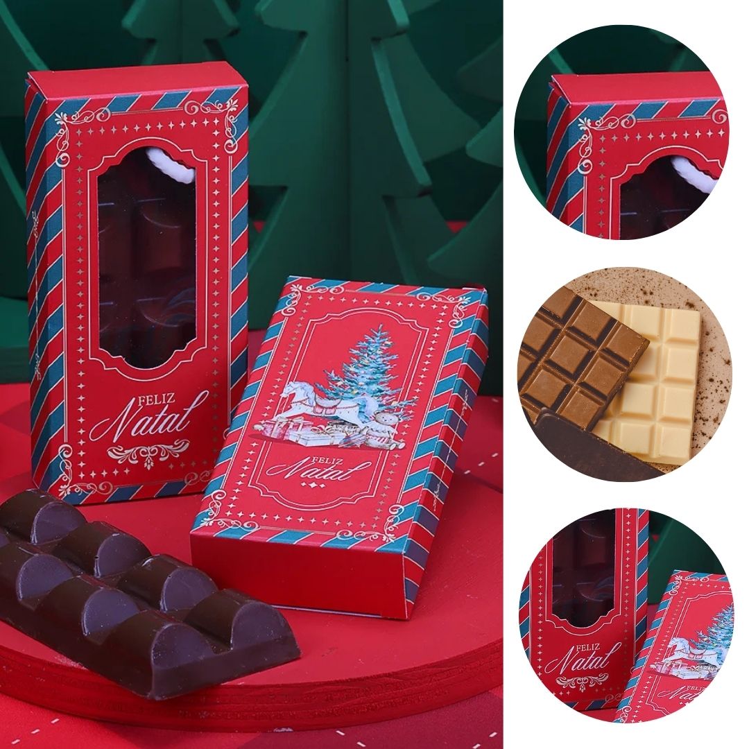 Frente: Fundo vermelho com moldura decorada e detalhe em formato de janela que permite visualizar o produto, acompanhado da frase Feliz Natal na base.