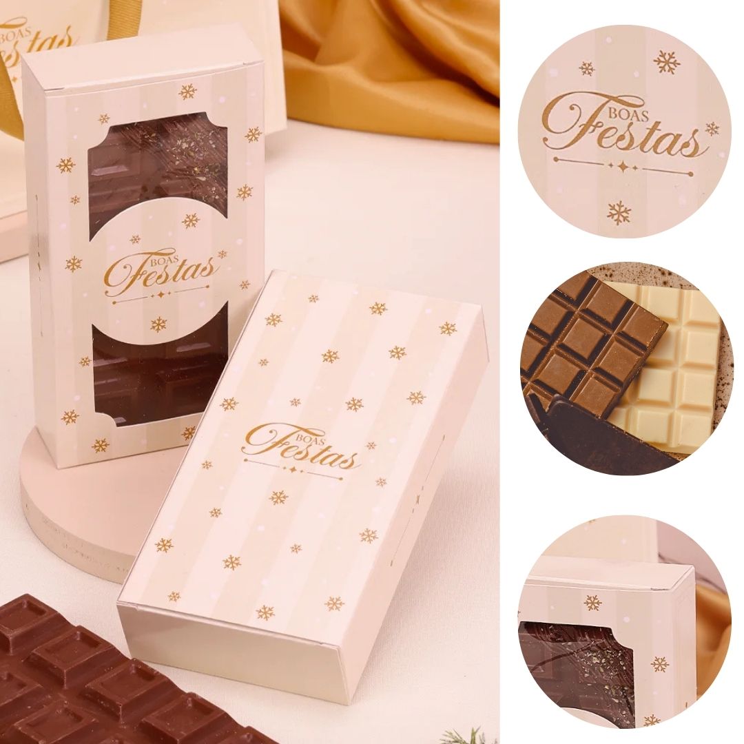 Frente: A estampa principal é de flocos de neve e estrelas douradas, espalhadas por toda a superfície. Uma faixa horizontal no centro da embalagem exibe a frase "Boas Festas" em letras douradas.