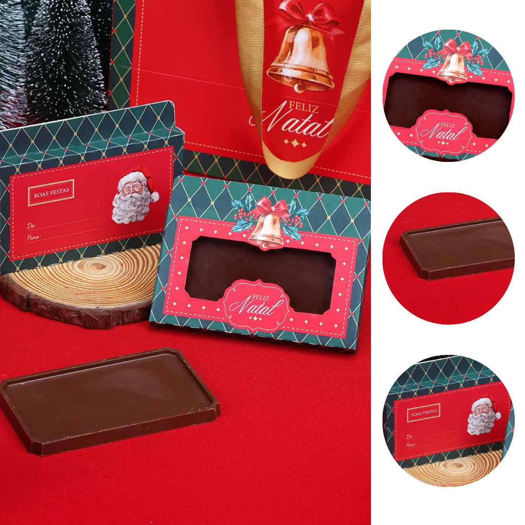 FRENTE: POSSUI UM VISOR TRANSPARENTE PARA QUE O CONTEÚDO POSSA SER VISTO. A FRASE "FELIZ NATAL" ESTÁ EM DESTAQUE, ACOMPANHADA PELA ILUSTRAÇÃO DE UM SINO COM LAÇO VERMELHO