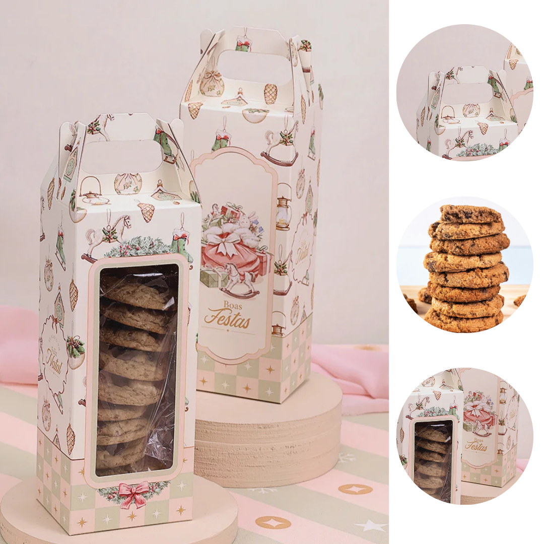 Lateral: é coberta por um padrão de ilustrações de enfeites de Natal, como pinhas, cavalinho de balanço, meia de natal
