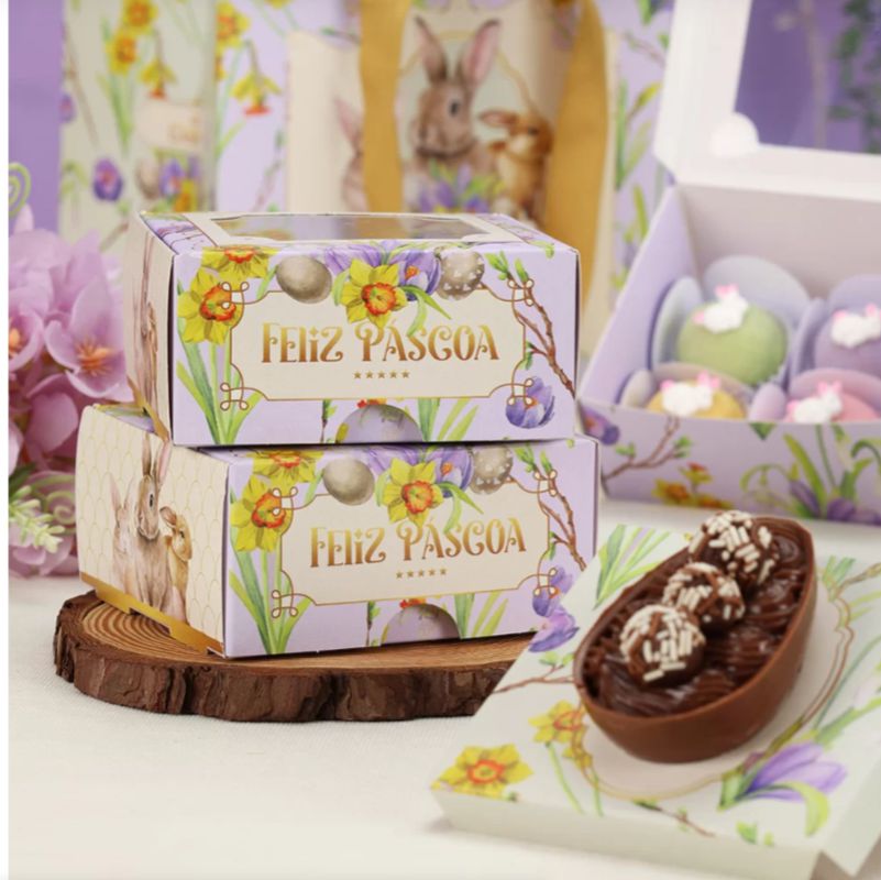 Lindas embalagens de PÁSCOA P/ impulsionar suas vendas. Confeccionada em papel triplx Premium. As Caixass possuem um designe único e de fácil montagem, que pode ser utilizadas P/ embalagem de ovos de páscoa, doces e chocolates