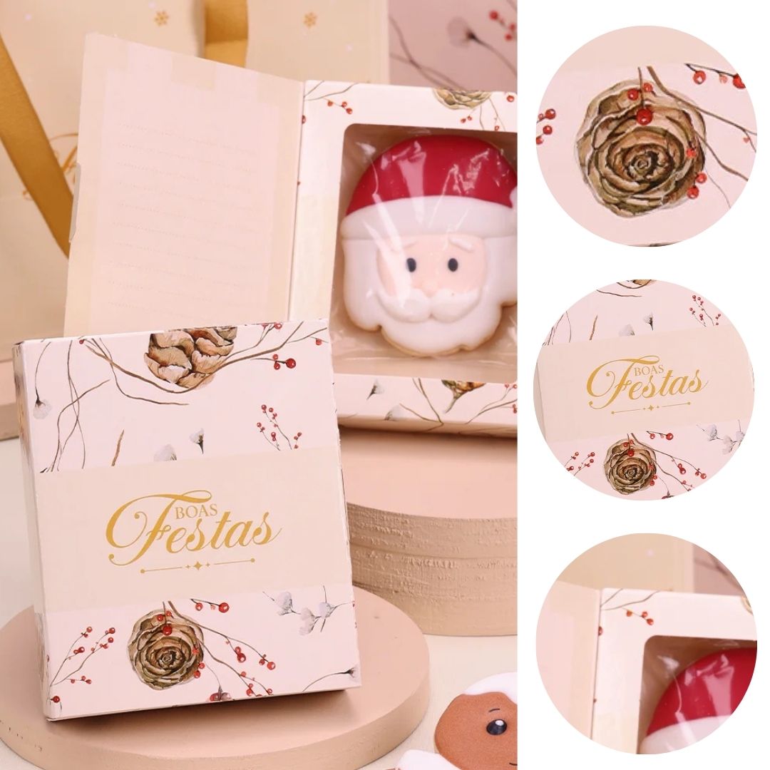 Frente: Estampa delicada em tons neutros com detalhes de pinhas e ramos natalinos, acompanhada da frase em dourado “Boas Festas”.