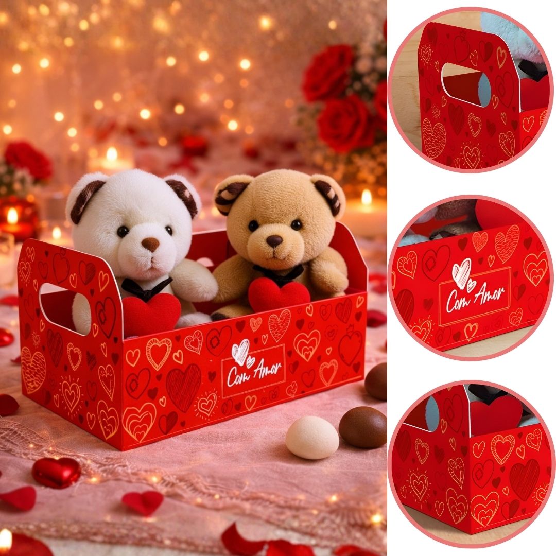 A CESTA CAIXOTE M TRAZ UM TOQUE RÚSTICO E MODERNO PARA SEUS PRESENTES. COM A ESTAMPA DE CORAÇÕES DA COLEÇÃO AMOR EM CAIXA, ELA SERVE COMO UMA BASE CHARMOSA E RESISTENTE PARA MONTAR DIVERSOS TIPOS DE KITS DE PRESENTE. UMA CESTA DECORATIVA QUE SURPREENDE.