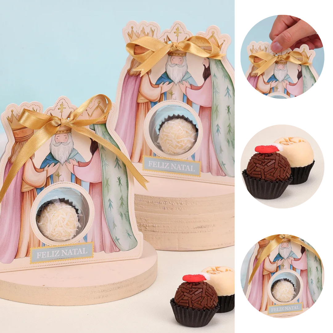 REPRESENTA OS 3 REIS MAGOS, CADA UM SEGURANDO O ESPAÇO REDONDO QUE ACOMODA O DOCE, SIMBOLIZANDO OS PRESENTES OFERTADOS AO MENINO JESUS.