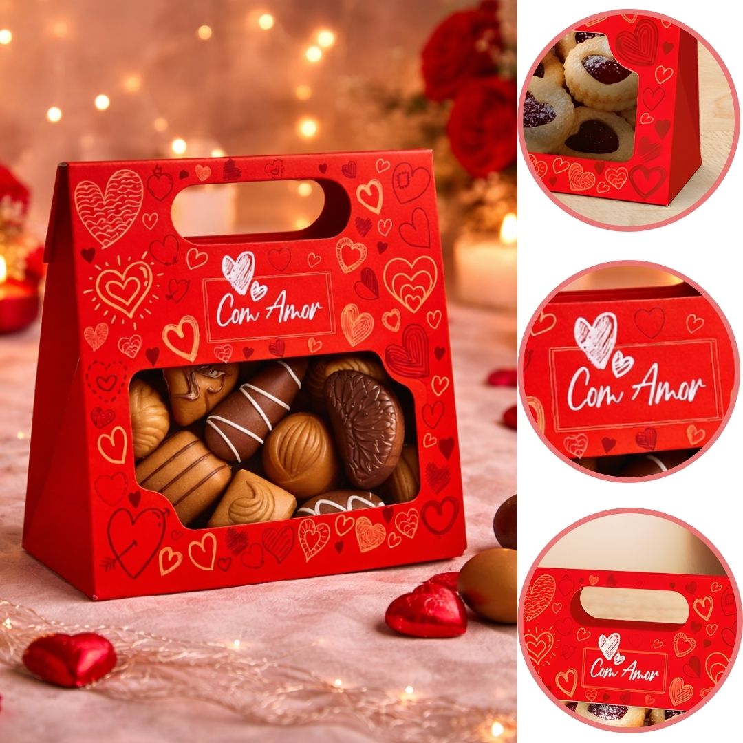 ESTA EMBALAGEM COM VISOR E ALÇA COMBINA A FUNÇÃO DE CAIXA COM A CONVENIÊNCIA DE UMA SACOLA. O VISOR FRONTAL EXIBE O CONTEÚDO COM CLAREZA, ENQUANTO A ESTAMPA VIBRANTE DE CORAÇÕES COMUNICA AFETO INSTANTANEAMENTE. UMA EMBALAGEM PRÁTICA PARA DOCES ARTESANAIS.