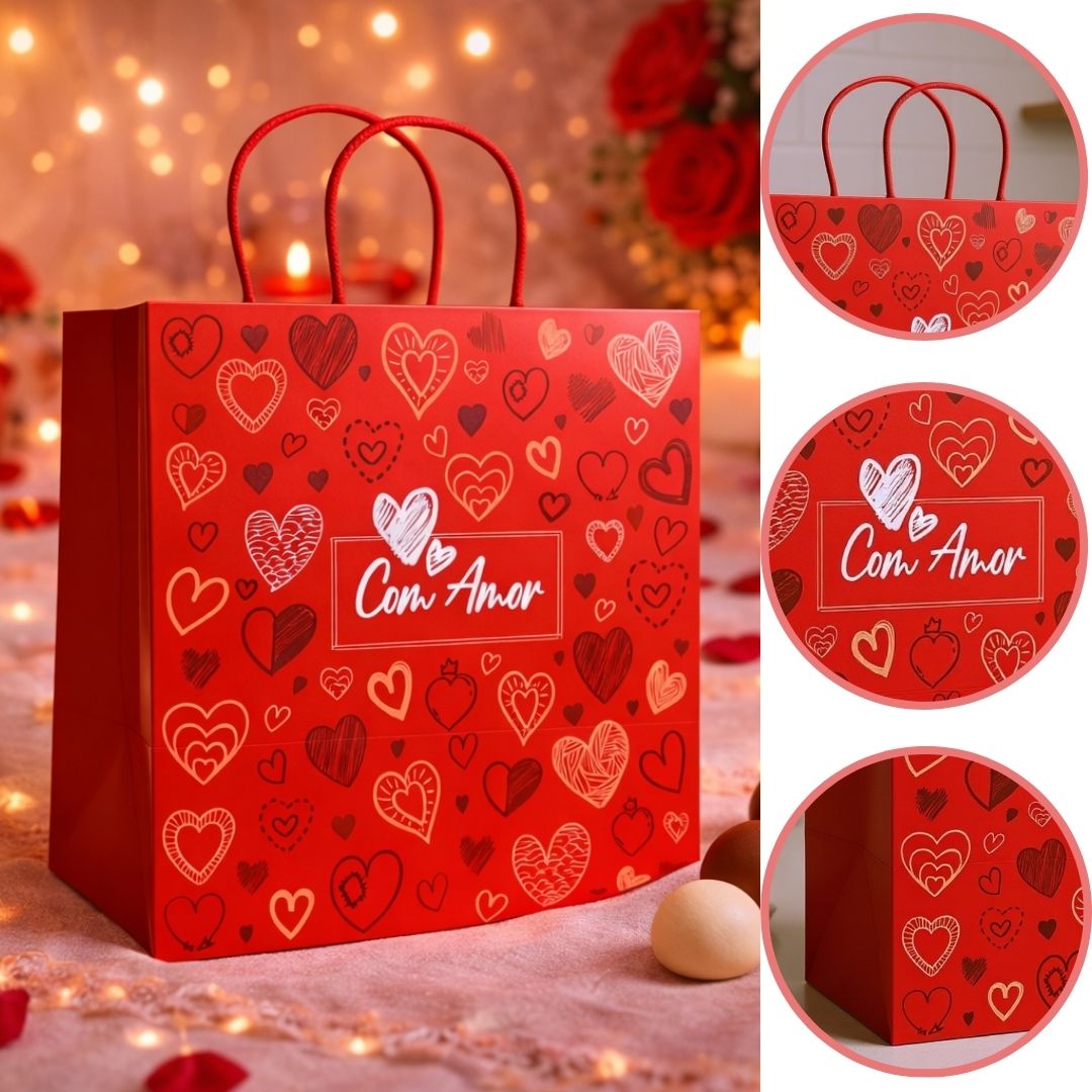 A SACOLA P1 DA LINHA AMOR EM CAIXA É VERSÁTIL E INDISPENSÁVEL. COM A ESTAMPA CARACTERÍSTICA DE CORAÇÕES DESENHADOS, ELA É A FINALIZAÇÃO PERFEITA PARA QUALQUER COMPRA OU PRESENTE FEITO COM CARINHO. UMA SACOLA PRÁTICA E CHARMOSA.