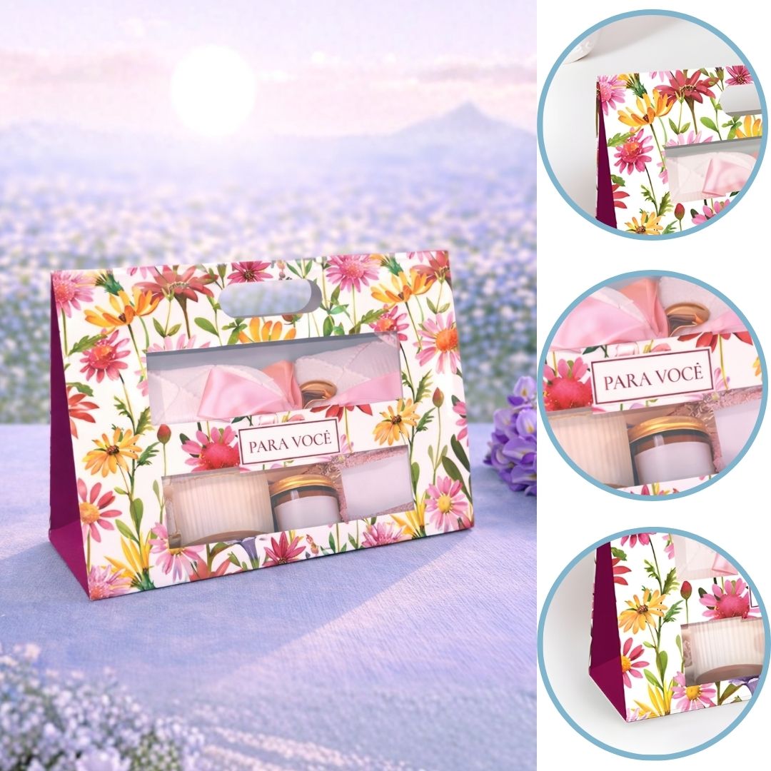 VISOR DUPLO QUE VALORIZA O PRODUTO; ALÇA PRÁTICA PARA TRANSPORTE; PAPEL CARTÃO PREMIUM; ESTAMPA FLORAL SOFISTICADA.