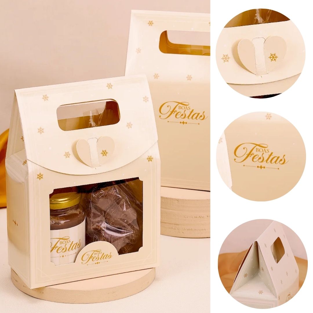 Ideal para montar kits com produtos pequenos. Acomoda perfeitamente 2 Vidros de 240ml, Caixa para barra 150g, 1 Cartão para biscoitos, Solapas.