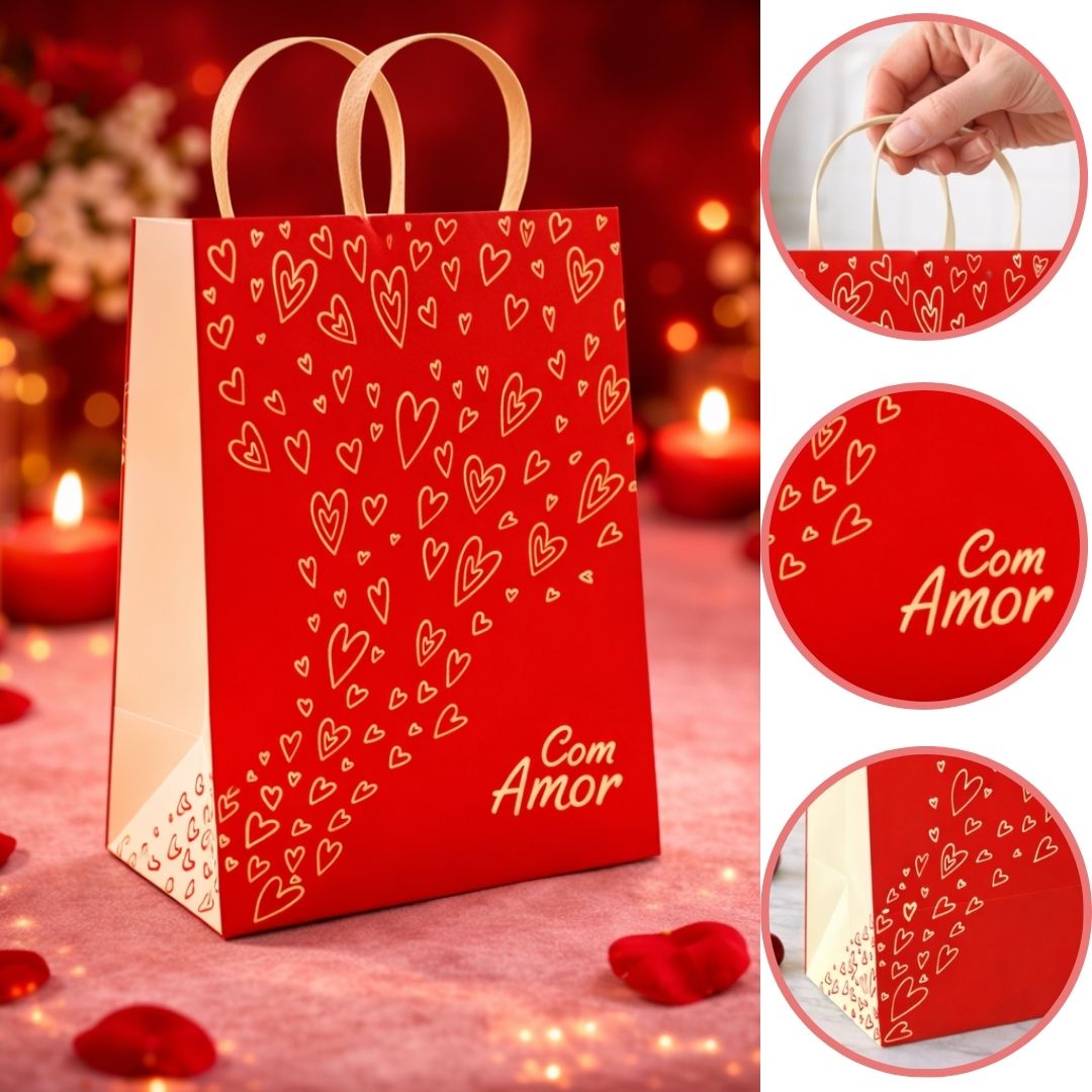 A SACOLA PP É A FINALIZAÇÃO PERFEITA PARA SEUS PRESENTES E ENVIOS. COM ESTAMPA DE CORAÇÕES E ALÇAS CONFORTÁVEIS, ELA COMPLEMENTA QUALQUER MIMO COM ELEGÂNCIA E PRATICIDADE.