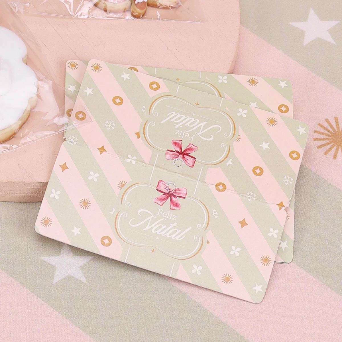FAIXAS DIAGONAIS EM ROSA E VERDE CLARO, DECORADAS COM ESTRELAS, FLORES E PEQUENOS ÍCONES NATALINOS DOURADOS, MOLDURA DOURADA COM A FRASE “FELIZ NATAL”, CONTORNADO POR ARABESCOS DOURADOS E ENFEITADO COM UM LAÇO ROSA NO TOPO.