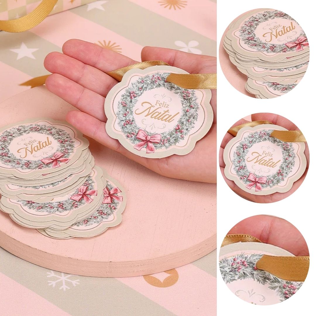 Frente: Traz a guirlanda natalina com laço rosado e frutinhas vermelhas, acompanhada da mensagem “Te desejo um Feliz Natal” em dourado, emoldurada por detalhes delicados e arabescos.