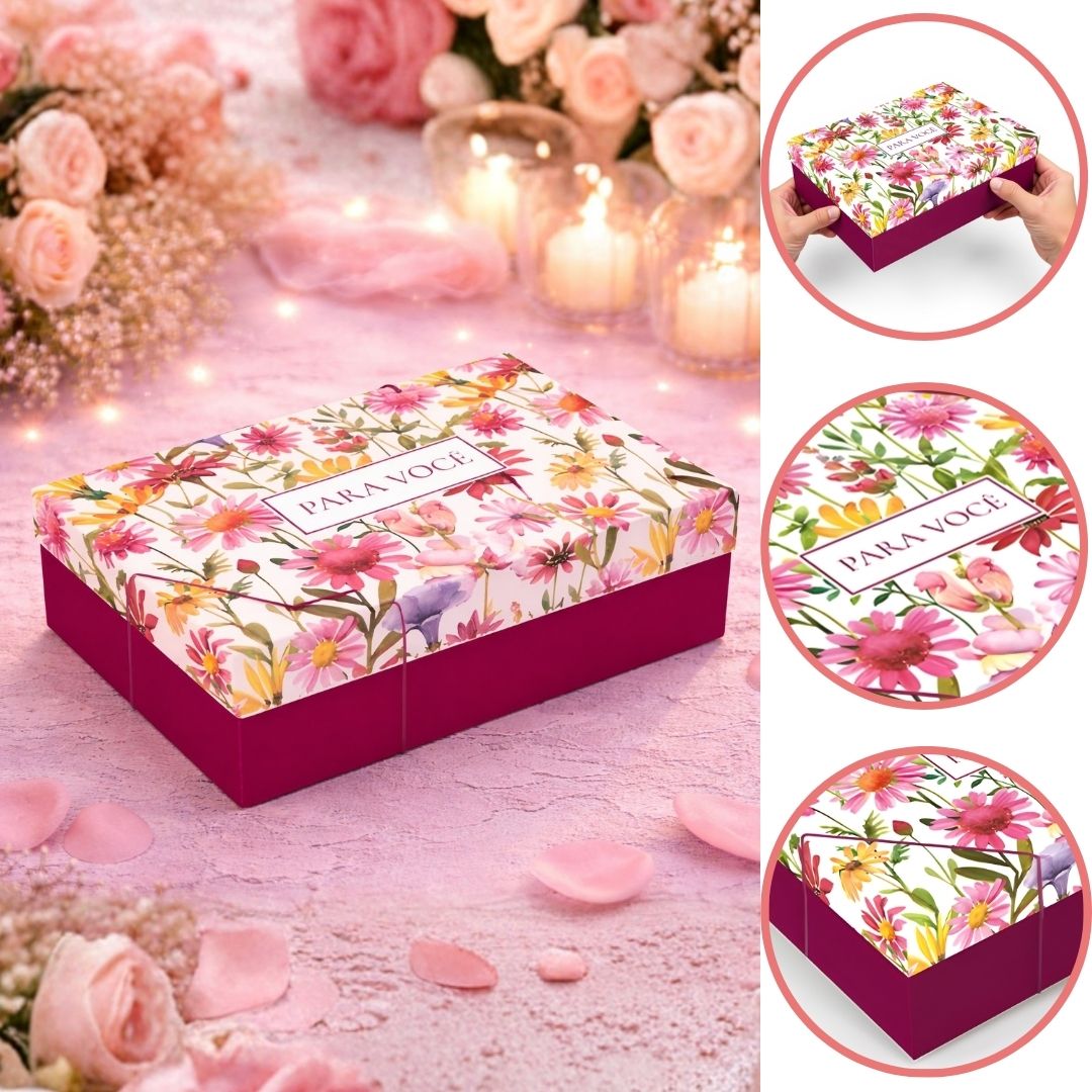 A CAIXA PRESENTE TAMPA E FUNDO CONJUGADA (M) É SINÔNIMO DE PRATICIDADE E BELEZA. COM MONTAGEM RÁPIDA E DESIGN FLORAL, É PERFEITA PARA PRESENTES QUE PRECISAM DE UMA APRESENTAÇÃO IMPECÁVEL.