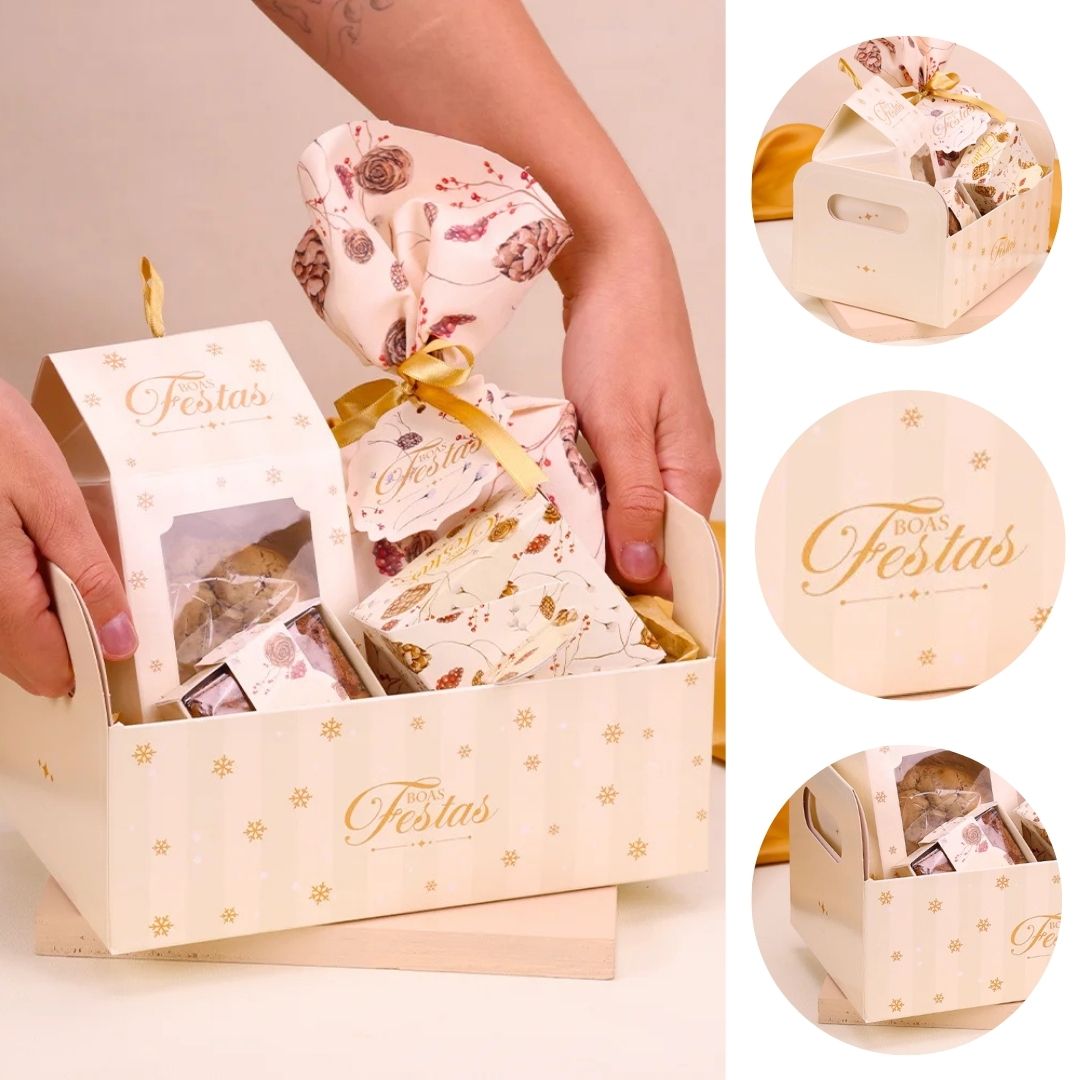 Frente: Ela é decorada com listras verticais e um padrão de flocos de neve dourados. A frase "Boas Festas" está escrita na parte frontal em letras douradas.
