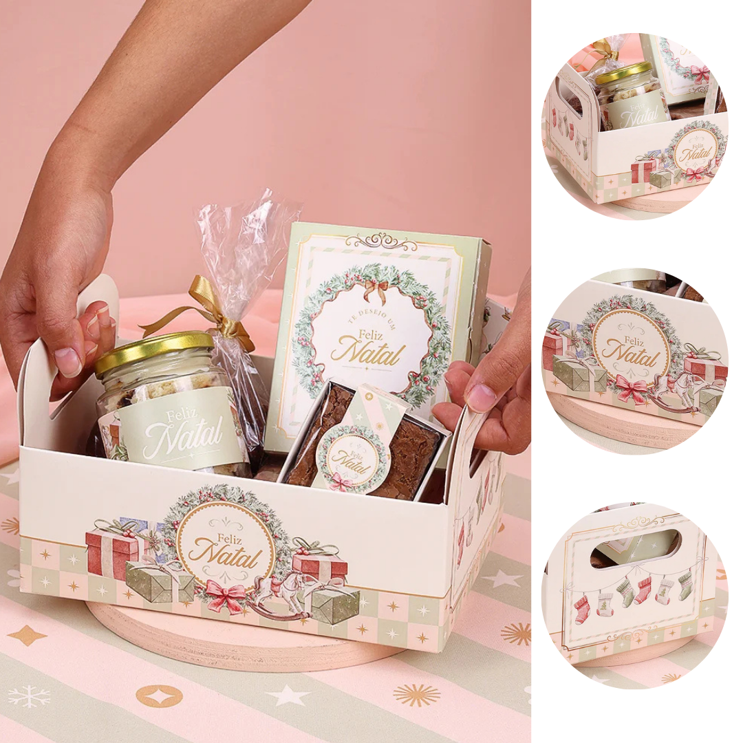 Laterais: decoradas com estampas suaves em xadrez e meias natalinas penduradas, que remetem ao aconchego das tradições de fim de ano.