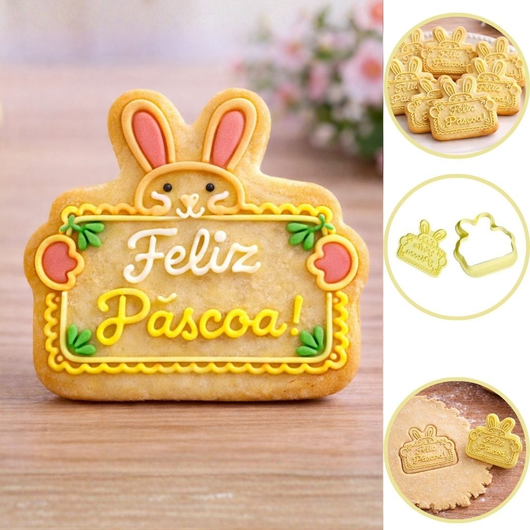 CORTADOR COM CARIMBO PLAQUINHA FELIZ PÁSCOA 8CM.