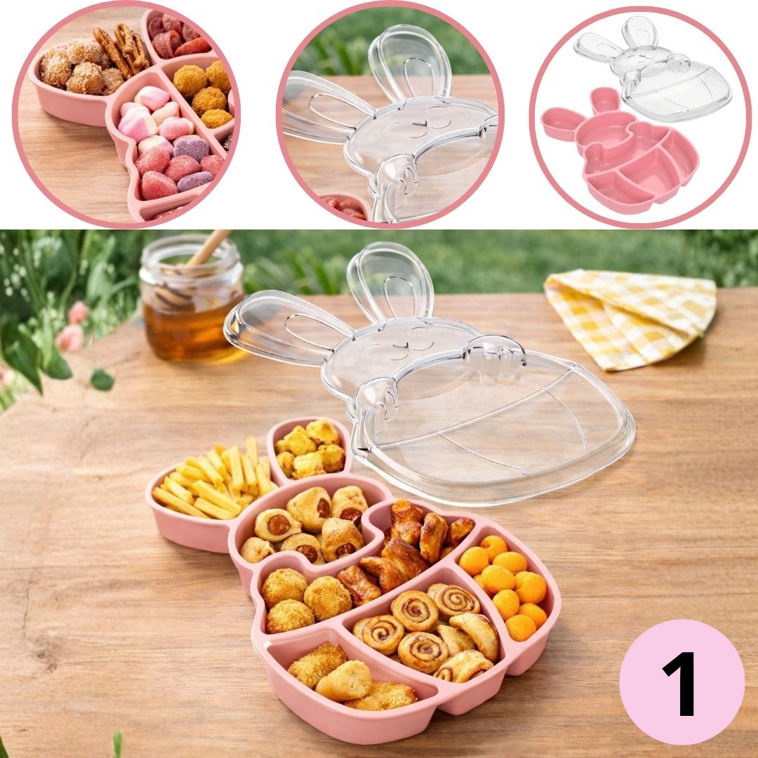 Sua cor rosa neutra combina facilmente com diversas decorações, enquanto a tampa transparente com formato de coelho protege os alimentos e valoriza a apresentação.